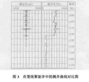 圖3是在中31- PXX籠統(tǒng)聚驅(qū)井中的測(cè)井曲線。測(cè)試條件是井內(nèi)既有油管又有套管。在1124m以上是內(nèi)徑為62mm油管段 ,以下是內(nèi)徑為124.6mm的套管段,儀器居中測(cè)井。左側(cè)是原磁性定位曲線,在油管段測(cè)速是900m/h,曲線有部分干擾;在套管段測(cè)速是90m/h,接箍曲線幅度低,部分接箍不能確定其具體位置。右側(cè)是更換后的接箍曲線,測(cè)井速度 100m/h,在油管段由于管柱內(nèi)徑小,曲線整體幅度高,接箍顯示清楚,1113m~1115m之間是封堵器,1124m處是油管喇叭口;在套管段由于管柱內(nèi)徑大,曲線整體幅度低,接箍顯示清楚。圖中不僅清楚地顯示出油管和套管的接箍位置,而且還能通過(guò)管柱內(nèi)徑的變化反映出不同的管柱結(jié)構(gòu)。