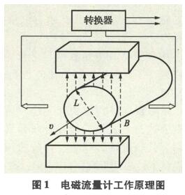 污水處理廠流量計是利用法拉*電磁感應(yīng)定律測量,如圖1所示,用于測量電極與運(yùn)動的流體構(gòu)成的回路中產(chǎn)生的電參數(shù),并根據(jù)公式換算成流體速度,再測量流通截面液位高度得到流通面積,兩者相乘得到所測流量。
