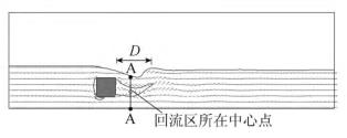 來自上游的水體經(jīng)浮體結(jié)構(gòu)的阻擋作用,水流繞流經(jīng)浮體結(jié)構(gòu)的上部和下部區(qū)域通過,并在浮體結(jié)構(gòu)背水面的下游區(qū)域形成小范圍回流區(qū),此處水流紊亂,流速分布不均勻。試驗(yàn)過程中,對(duì)回流區(qū)沿水流方向的長度D(水槽縱向中心斷面處,自浮體結(jié)構(gòu)背水面到沿水流方向流速為0的*遠(yuǎn)位置點(diǎn))進(jìn)行量測(cè)。選取浮體結(jié)構(gòu)下游區(qū)域回流區(qū)中心點(diǎn)所在斷面進(jìn)行流速測(cè)量對(duì)比。流速測(cè)量斷面位置A-A見圖3。