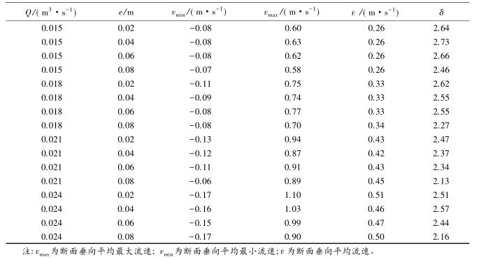 流速沿?cái)嗝娣植嫉木鶆蛱匦钥梢酝ㄟ^流速分布不均勻系數(shù)進(jìn)行表征,通過所選取斷面*大流速和*小流速的差值與該斷面平均流速的比值,δ值越大表明浮體結(jié)構(gòu)的存在對(duì)水流斷面流速的分布產(chǎn)生的影響較大。表2中,當(dāng)來流流量相同時(shí),流速的不均勻系數(shù)多數(shù)隨e的增大而減小。浮體結(jié)構(gòu)位置較小時(shí),主流為浮體結(jié)構(gòu)上部的水流。隨著浮體結(jié)構(gòu)位置的上升,來自上游的水體逐漸分成浮體結(jié)構(gòu)上部和下部的兩股主流,流速分布的不均性減小。浮體結(jié)構(gòu)位置及所處水位條件相同時(shí),來流流量的增大,區(qū)域的平均流速增大,因此流速不均勻性減小。