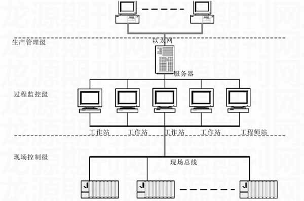 針對(duì)鎢礦選廠生產(chǎn)的實(shí)際需求,這里應(yīng)用相應(yīng)的自動(dòng)化技術(shù),對(duì)自動(dòng)化監(jiān)控系統(tǒng)進(jìn)行了設(shè)計(jì)。在系統(tǒng)設(shè)計(jì)中,遵循“方案合理、技術(shù)先進(jìn)、運(yùn)行可靠、操作方便”的原則,系統(tǒng)整體采用集散控制系統(tǒng),基于現(xiàn)場總線通訊,其整體網(wǎng)絡(luò)構(gòu)架如下: