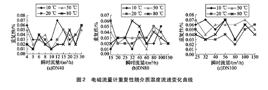 將實(shí)驗(yàn)測得的廢水流量計(jì)在不同溫度及流速下的重復(fù)性數(shù)據(jù)整理,特性曲線如圖2所示,3組曲線分別對應(yīng)DN40, DN80, DN100的3塊廢水流量計(jì)的重復(fù)性曲線。
