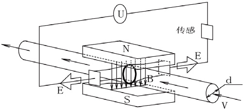 如圖,測(cè)量流量時(shí),流體流過垂直于流動(dòng)方向的磁場(chǎng),導(dǎo)電性流體的流動(dòng)感應(yīng)出一個(gè)與平均流速成正比的電勢(shì)。其感應(yīng)電壓信號(hào)通過兩個(gè)電極檢出,并通過電纜傳送至轉(zhuǎn)換器,經(jīng)過信號(hào)處理及相關(guān)運(yùn)算后,將累計(jì)流量和瞬時(shí)流量顯示在轉(zhuǎn)換器的顯示屏上。