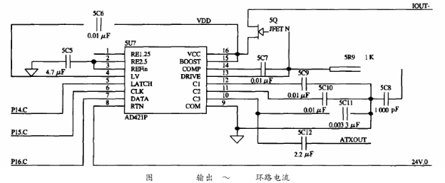 HT2012需要外部提供460.8kHz的時(shí)鐘信號(hào),且要求時(shí)鐘頻率的誤差是0.1%,若直接入一個(gè)460.8kHz的晶振不僅會(huì)引起系統(tǒng)功耗的增加,而且該晶振屬于非標(biāo)準(zhǔn)晶振,需專門定制。為了解決這一問題,在系統(tǒng)中采用一片1.8432MHz的晶振以產(chǎn)生時(shí)鐘信號(hào),再經(jīng)分頻器CD4013進(jìn)行4分頗,可輸出1.8432MHz/4=460.8kHz的分頻信號(hào)供HT2012使用。AD421其內(nèi)部的電壓調(diào)節(jié)器與外部的場(chǎng)效應(yīng)管DN25D對(duì)輸入到AD421的電壓進(jìn)行調(diào)整,可提供+3.3V電壓作為其他設(shè)備的電源。HART發(fā)出的FSK信號(hào),經(jīng)過一個(gè)電容耦合送到AD421中,轉(zhuǎn)換成相應(yīng)的0.5mA正弦電流信號(hào),實(shí)現(xiàn)電壓信號(hào)到電流信號(hào)的轉(zhuǎn)換,同時(shí),疊加在4~20mA的電流上送給接收設(shè)備,實(shí)現(xiàn)了HART協(xié)議的信息的交換。本電路耦合電容取為0.0033μF,如圖5所示。