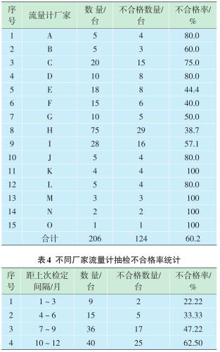 主要分析了油田內(nèi)常用廠家產(chǎn)品的檢定合格率,各廠家流量計(jì)檢定合格率對(duì)比見表3。從表3中可以看出:氣體流量計(jì)周期內(nèi)誤差超差概率偏大,總體達(dá)60%。