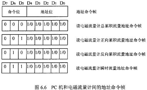 由于RS一485電氣標(biāo)準(zhǔn)規(guī)定每段只能聯(lián)結(jié)犯?jìng)€(gè)節(jié)點(diǎn)設(shè)備,因此可用地址幀中五個(gè)二進(jìn)制位表示這32個(gè)地址,其余3位用來(lái)表示命令,從而構(gòu)成地址命令幀。對(duì)于控制命令需求不超過(guò)八個(gè)的通信系統(tǒng),采用地址命令幀可壓縮報(bào)文長(zhǎng)度提高通信效率。在污水網(wǎng)絡(luò)監(jiān)控系統(tǒng)中,飲用水流量計(jì)和PC機(jī)通信的主要目的是將流量計(jì)中的有用數(shù)據(jù)讀到PC機(jī)中。這些數(shù)據(jù)包括:總累積流量、正向累積流量、反向累積流量、瞬時(shí)流量。通信時(shí),PC機(jī)只需向飲用水流量計(jì)發(fā)送讀總累積流量、讀正向累積流量、讀反向累積流量、讀瞬時(shí)流量命令即可,因此二者間通信所用的地址幀和命令幀可合二為一,用一個(gè)地址命令幀代替。PC機(jī)和飲用水流量計(jì)間的地址命令幀定義如圖.66所示。根據(jù)污水網(wǎng)絡(luò)監(jiān)控系統(tǒng)中PC機(jī)與飲用水流量計(jì)間通信的特殊性,二者通信所使用的報(bào)文可簡(jiǎn)化為圖.67的格式。