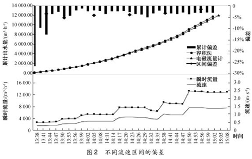 利用水廠的構(gòu)筑物作為測量容器,測量構(gòu)筑物內(nèi)水位在一定時間范圍內(nèi)的變化高度,以此來計算構(gòu)筑物內(nèi)水量的變化體積,將此結(jié)果與相同時間段內(nèi)電磁流量計的累計流量相比較,從而確定電磁流量計的計量性能。本次實施過程中,兼顧了不同的流速區(qū)間。
