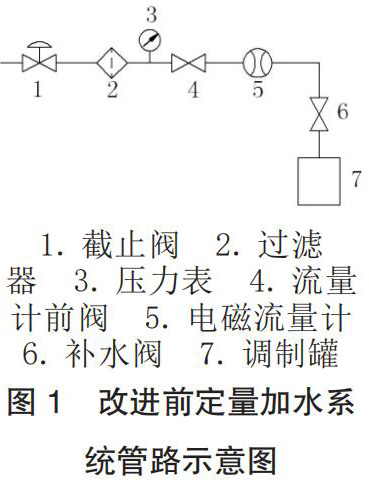 工廠的香料廚房系統(tǒng)為國內(nèi)煙機(jī)公司 2004 年設(shè)計(jì)制造,其定量加水系統(tǒng)主要由水源、白酒流量計(jì)、加水管路元件和控制程序這四部分組成,改進(jìn)前管路示意圖如圖 1 所示。