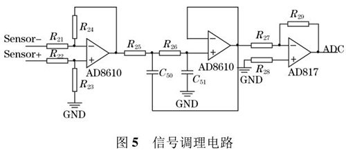 如圖4 所示,信號調(diào)理電路由前置放大電路、濾波電路以及二次放大電路組成。其中前置放大電路主要是由 AD8610 組成的差分放大電路構(gòu)成,其主要是去除信號中的共模干擾并且進行*一次前置放大,前置放大電路的放大倍數(shù)為 15。由于有效信號的幅值很小,經(jīng)過前置放大電路后信號中還存在很多高頻雜波,這些雜波會影響對后級信號的處理,因此還需要對前置放大電路輸出的信號進行低通濾波和二次放大。系統(tǒng)選用二階有源低通濾波電路濾除信號中的高頻干擾,低通濾波的截止頻率設(shè)定在 6 kHz 左右,選用 AD817 組成的二次放大電路對濾波電路輸出的信號進行二次放大,將信號調(diào)理電路輸出的信號調(diào)整在 0~5 V 之間,*終利用 DSP 內(nèi)部的 AD 轉(zhuǎn)換器對此信號進行模數(shù)轉(zhuǎn)換得出傳感器線圈輸出的感應(yīng)電動勢,從而根據(jù)相關(guān)的公式計算得出管道中液體的流量。具體電路圖如圖 5 所示。