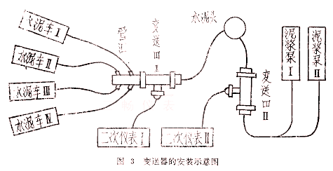 變送器II(重油流量計(jì))安裝在水龍帶與水泥頭之間,信號(hào)送至二次儀表II,用以計(jì)量泥漿泵所替泥漿量