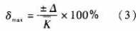 圖2顯示測(cè)量出電脈沖信號(hào)頻率F用平均儀表系數(shù)`K計(jì)算得到的Q值,在Qmin~Qmax范圍內(nèi)的*大相對(duì)誤差為: