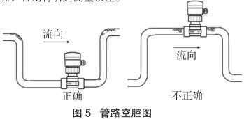 測(cè)量流向取決于航空煤油流量計(jì)的安裝方位,將航空煤油流量計(jì)在接頭上旋轉(zhuǎn) 180 度即可反向。正流向時(shí),航空煤油流量計(jì)的突耳應(yīng)在上游方向。流量顯示總是正的,而累加器可以根據(jù)流向增加或者減少。安裝中確認(rèn)管路設(shè)計(jì)不允許在介質(zhì)中產(chǎn)生氣泡或空腔,否則將引起測(cè)量誤差(見圖 5)。