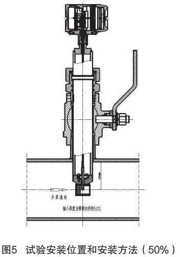 對插入式渦街流量計和插入式電磁流量計的結(jié)構(gòu)原理進(jìn)行分析,插入式電磁流量計的信號采集點(diǎn)在標(biāo)校管道內(nèi)12.5% 為宜,因它屬電磁類流量計,而流量計是根據(jù)“卡門渦街”原理進(jìn)行測量管道內(nèi)流量,根據(jù)標(biāo)校管道內(nèi)層流和湍流的分析,以及流量計獨(dú)特的探頭結(jié)構(gòu)形式,確定煙氣流量計的插入深度為標(biāo)校管道內(nèi) 50%,試驗(yàn)安裝位置和安裝方法如圖 5 所示。