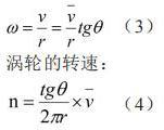 為了推導(dǎo)渦輪轉(zhuǎn)速和燃油質(zhì)量流率的關(guān)系,可先將渦輪展開,渦輪帶箭頭的斜線表示燃油流向。如果渦輪固定不動,流體流過葉片時將受到阻力,則當(dāng)燃油離開渦輪的葉片時,將產(chǎn)生一個切向速度 V。