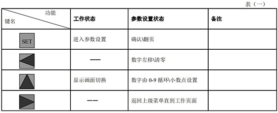 3.2、參數(shù)設(shè)置約定:在設(shè)置各項(xiàng)參數(shù)時(shí),提示符閃動(dòng)代表該項(xiàng)參數(shù)沒有設(shè)置完或者尚未確認(rèn),可以通過按SET 鍵來(lái)確認(rèn)或者按→鍵退出;提示符不閃動(dòng)代表該項(xiàng)參數(shù)已設(shè)置完并確認(rèn),此時(shí)可以通過按 SET 鍵翻頁(yè)或者按→鍵退出。進(jìn)入?yún)?shù)設(shè)置時(shí),需要輸入密碼(6 位)并確認(rèn)進(jìn)入,為了防止誤進(jìn)入?yún)?shù)設(shè)置菜單,保證儀表正常工作,在設(shè)置密碼時(shí),使用↑鍵調(diào)數(shù)時(shí)不能循環(huán)調(diào)數(shù),只能單次調(diào)數(shù),只有密碼輸入正確進(jìn)入各項(xiàng)參數(shù)設(shè)置菜單后才可以對(duì)各位循環(huán)連續(xù)調(diào)整數(shù)據(jù)。