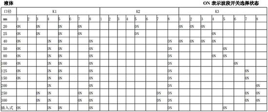 以上表值僅供參考,實(shí)際使用中因液體粘度和氣體密度不同應(yīng)在此值附近調(diào)整,頻率低時可將 K3 向大口徑方向調(diào)一至三檔。頻率高時可將 K2 向小口徑方向調(diào)一至三檔。